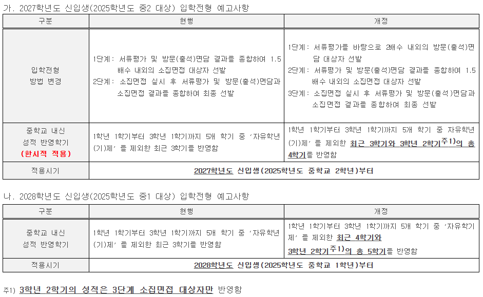 부산일과고에서 2027학년도 및 2028학년도 신입생 입학전형 변경사항을 다음과 같이 공지하였습니다.